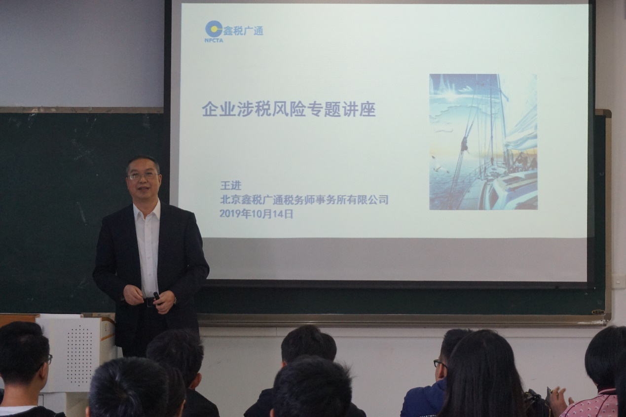 首先,王进董事长解释了由于税收作为财政的重要来源、国家运转的重要基础,所以企业涉税风险有其存在的客观必然性,强调我们作为财税人要有过硬的专业素质、良好的职业规划,才能在企业的涉税业务中最大程度上规避风险。接着,他运用几个生动的实例,从主观、客观因素分析了涉税风险的原因,指出税务风险和经营理念、人员素质、管理流程等因素密切相关。同时,还重点强调了处理税务事件不仅要有专业的团队以及专业复核和审批程序,处理结果更要及时反馈给高层,并提出了企业应从增强对税法理解、开展税务自查、转变经营理念、提高风险意识等方面来控制涉税风险。最后,他详细介绍了北京鑫税广通税务师事务所有限公司,希望同学们到专业对口的岗位工作,真正做到学有所用,将专业知识转化为社会前进动力。