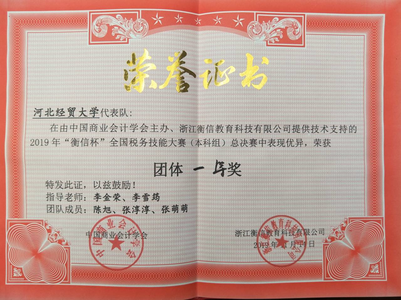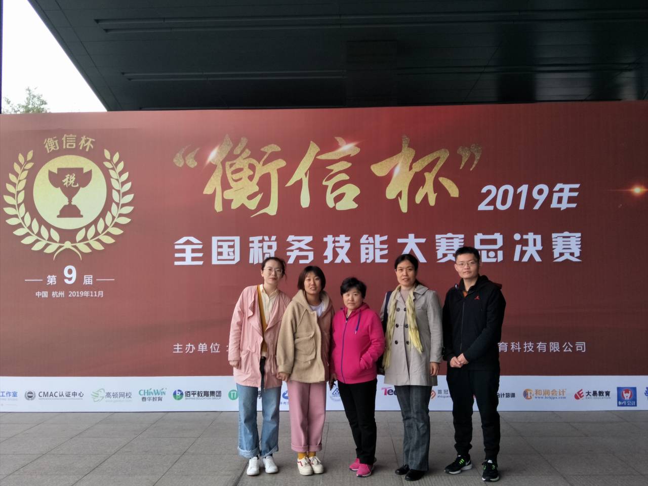 11月11—14日, 2019年“衡信杯”全国税务技能大赛总决赛在杭州举行,EMC易倍代表队在本次比赛中荣获团体一等奖,张淳淳同学获得个人三等奖。张淳淳、陈旭、张萌萌同学获得衡信科技教育有限公司免试入职通知书。李金荣老师荣获优秀指导教师称号,李雪筠老师荣获优秀带队教师称号。