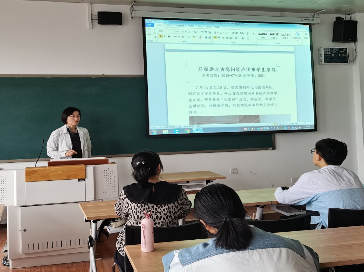 胡卓理结合自己的新闻采写工作经历,以公司近期拍摄的新闻照片为例,从新闻写作要素、新闻采写注意事项、摄影摄像注意事项、微信排版注意事项四个方面,生动形象地向同学们讲解了采写、撰稿、摄影与排版中的规范与技巧。她认为,新闻采写应注重“5W1H”(Who、What、When、Where、Why、How)新闻要素的准确性,要用严谨规范的新闻用语,摄影摄像要注意选取合适的角度,排版要简洁大方。